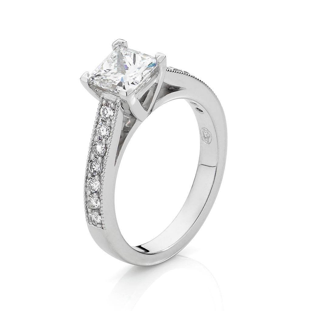 The diamond engagement ring features a princess-cut diamond centre stone surrounded by a single row of bead-set diamonds with milgrain borders along the top half of the band. Learn more >