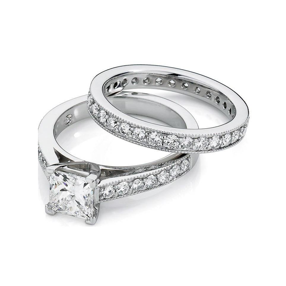 The wedding ring is a diamond eternity ring with round brilliant cut diamonds bead set all the way around the band, perfectly matching the engagement ring. Learn more >